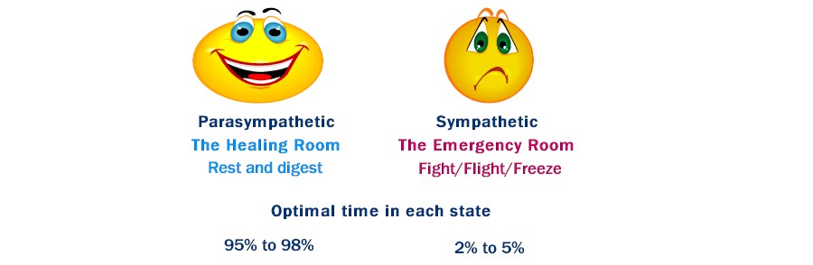 Thinking of the sympathetic nervous system as a rainy-day fund is beneficial. It’s intended use is only for life-saving moments, because it causes us to exist in a state of high alert, using the stress response. We should only live 2 to 5 percent of our lives in this Emergency Room.
